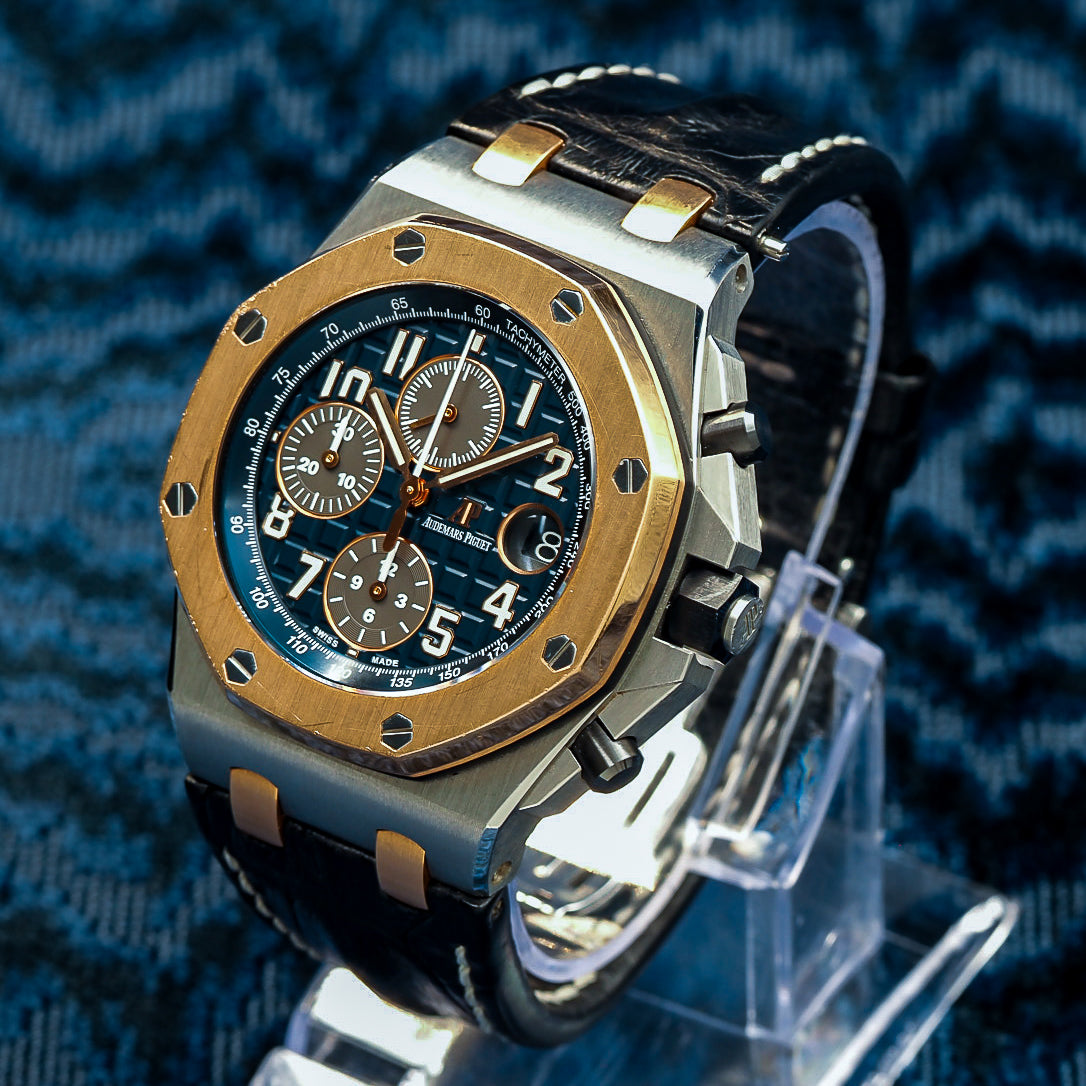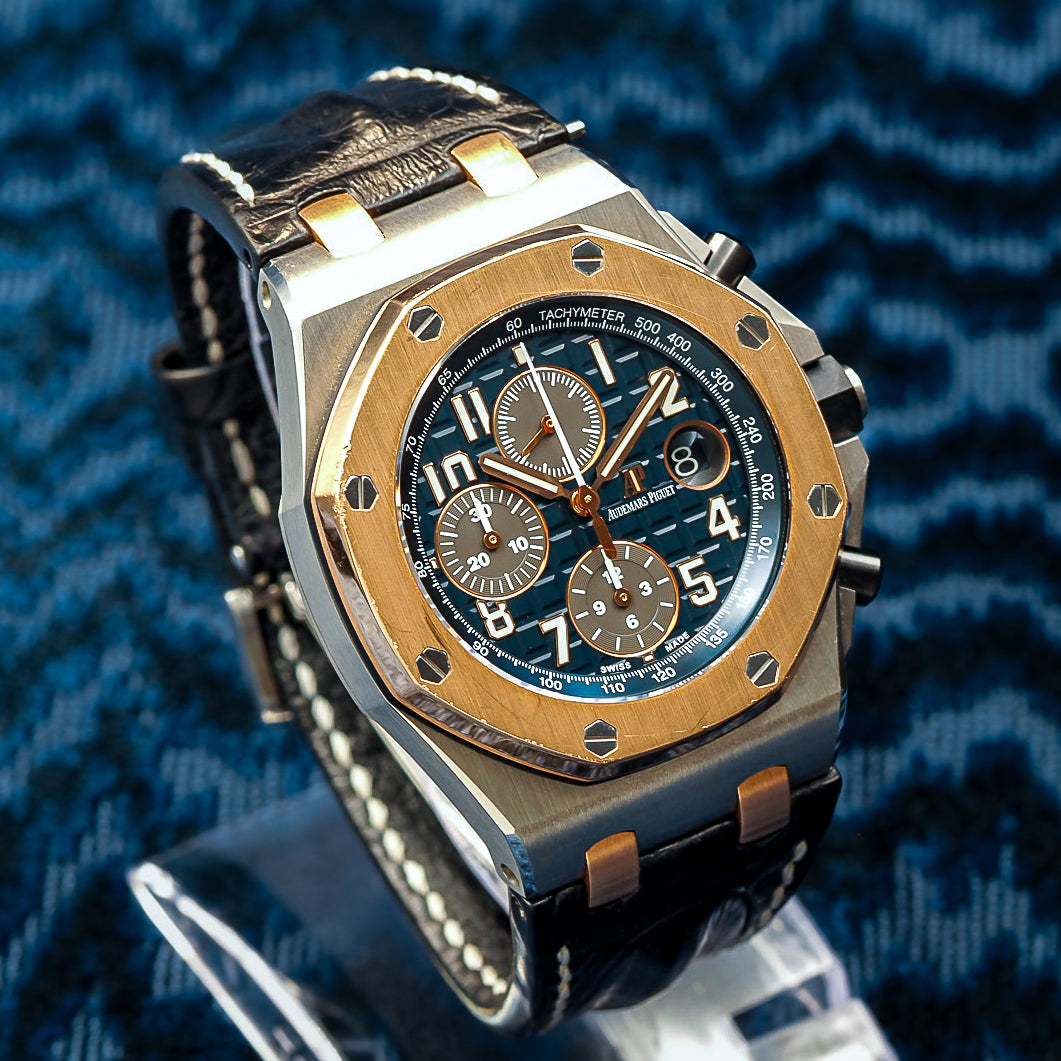 Introducing the Audemars Piguet Royal Oak Offshore Chronograph 26471SR.OO.D101CR.01, an exquisite fusion of sportiness and elegance. This two-tone chronograph features a bold 42mm case crafted from stainless steel with an 18k rose gold bezel, offering a luxurious contrast that sets it apart within the Offshore collection.