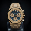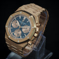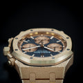Presenting the Audemars Piguet Royal Oak Perpetual Calendar 41mm Reference 26239OR.GG.1224OR.01, an exceptional timepiece that represents the pinnacle of Audemars Piguet’s craftsmanship. This Royal Oak stands out with its breathtaking 18k hammered gold case and bracelet, known as the "Frosted Gold" finish, giving it a dazzling yet refined look. Combined with the striking blue "Grande Tapisserie" dial, this watch is a statement of both technical prowess and contemporary luxury.