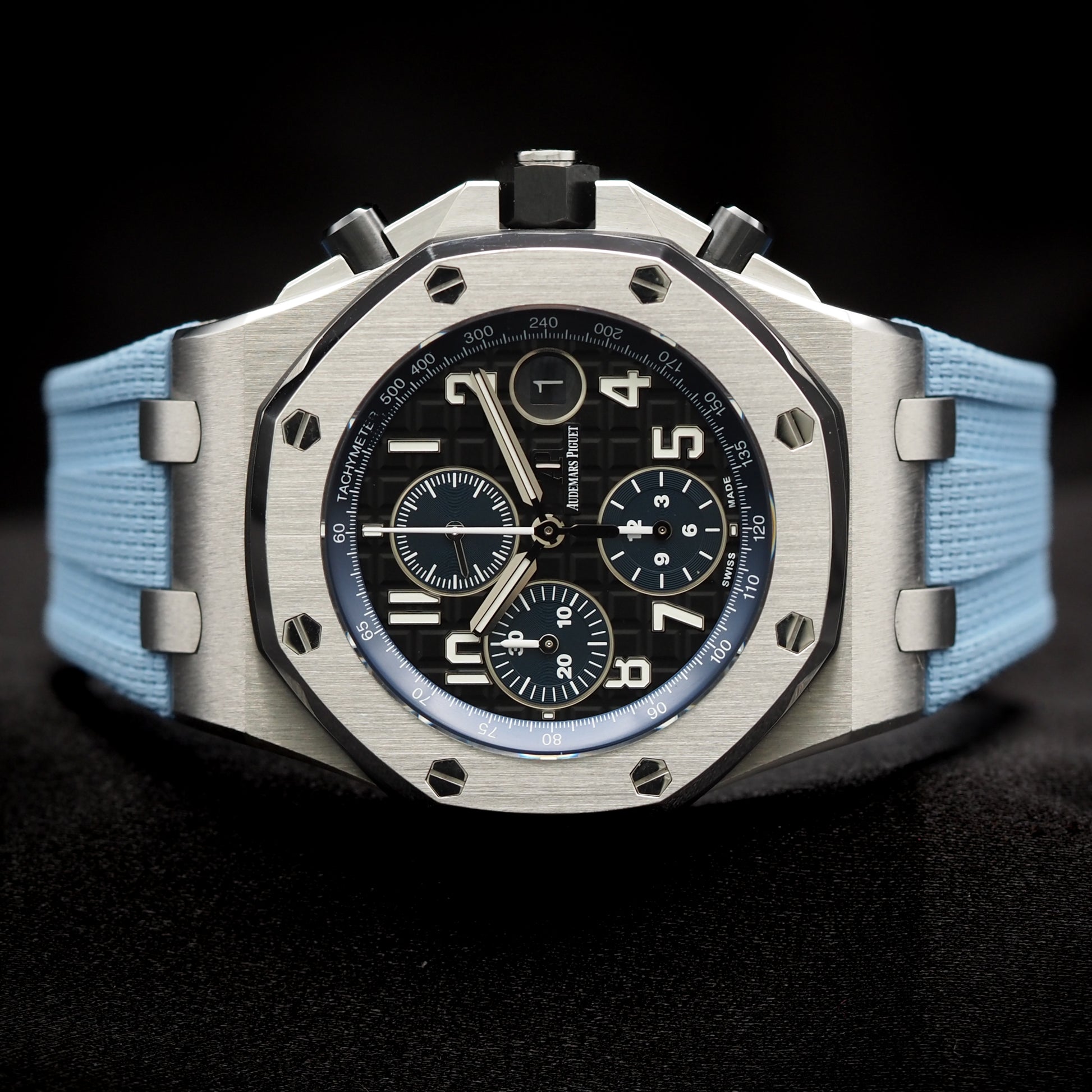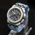 Presenting the Audemars Piguet Royal Oak Offshore "Batman" 26470ST.OO.A028CR.01, a striking timepiece that combines the brand’s signature craftsmanship with a bold black-and-blue aesthetic. This highly sought-after model, nicknamed "Batman" due to its color scheme, stands out with its refined yet aggressive design, making it a must-have for collectors and enthusiasts.