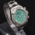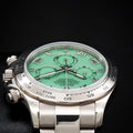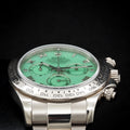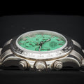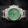 Introducing the highly coveted Rolex Cosmograph Daytona 116509 “Green Beach Dial”, a rare and discontinued gem in the Daytona lineup. Cased in 18k white gold and featuring the vibrant olive green sunburst dial, this reference combines sporty function with unmatched elegance—earning its nickname as the “Green Beach” Daytona.
