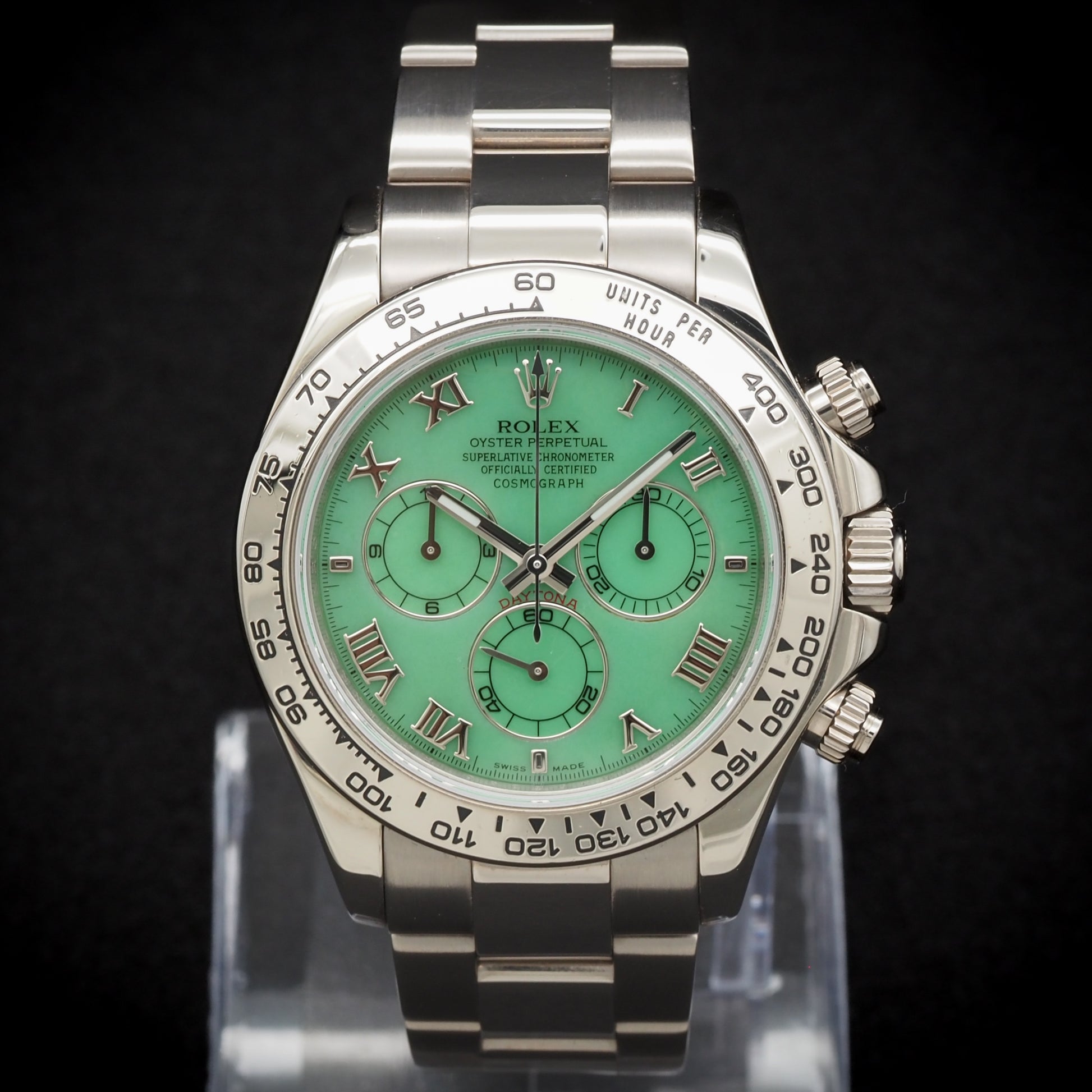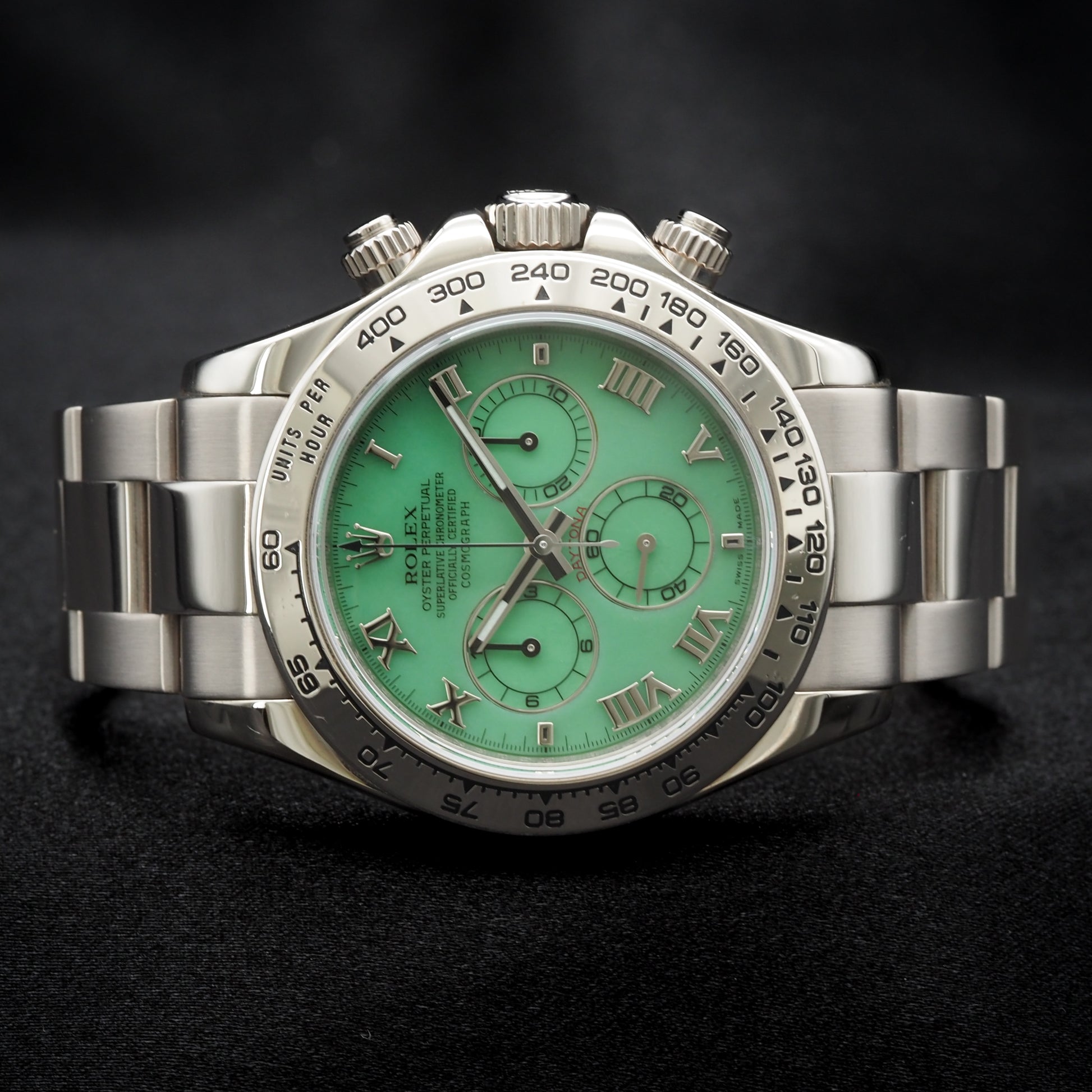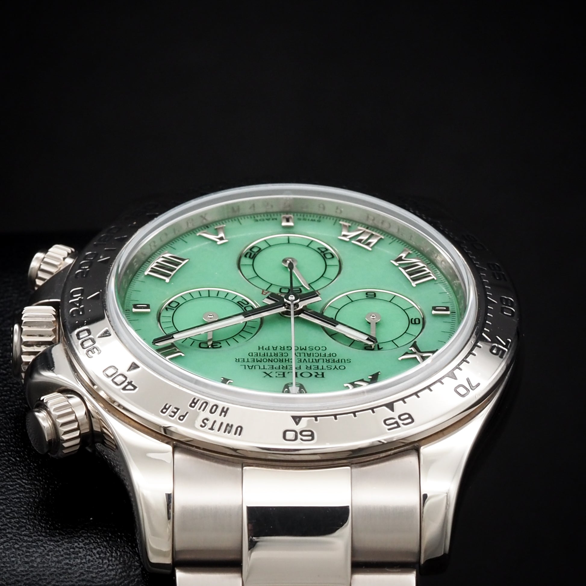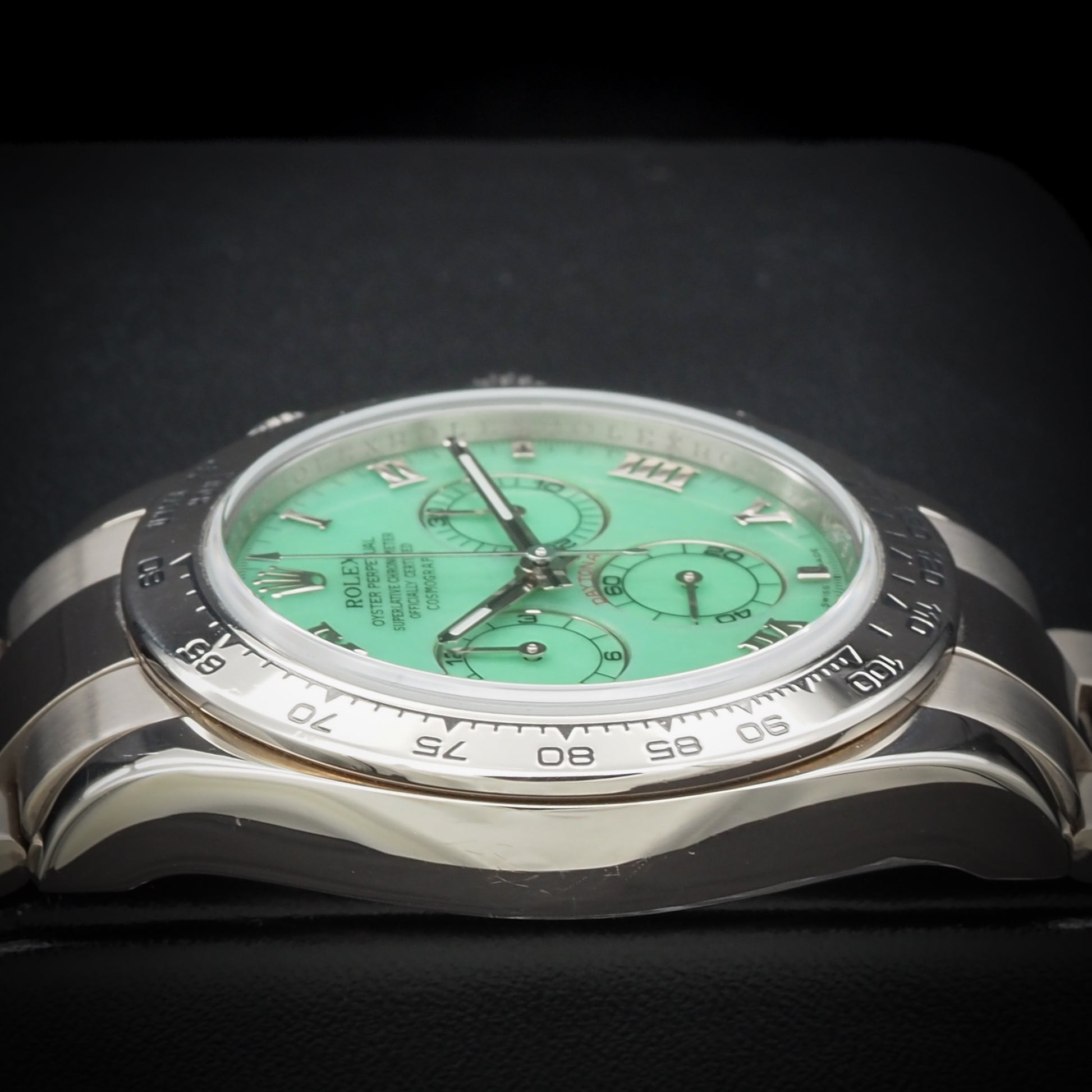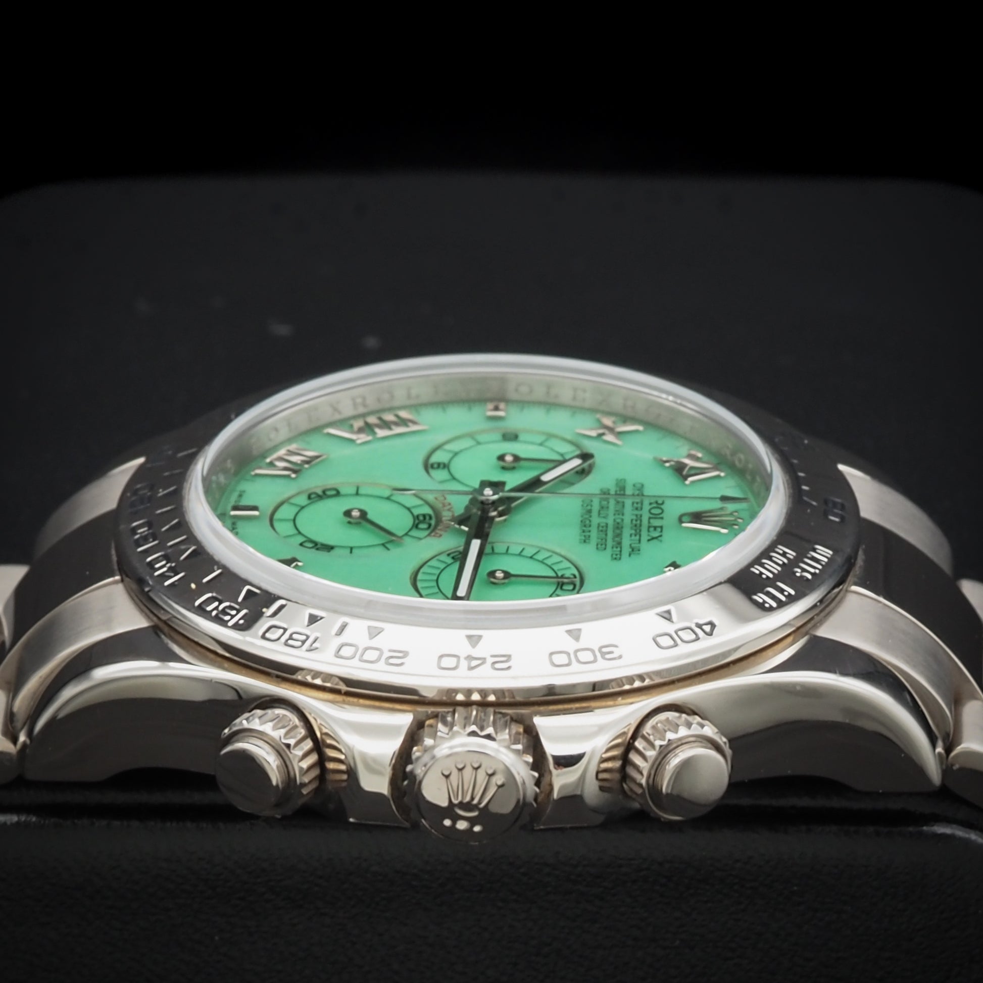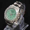 This timepiece is in excellent condition, showing only minimal wear. It is offered as a complete full set, including the original Rolex box, warranty card, manuals, and accessories. A true collector's watch, this version is no longer in production and continues to rise in value. Brand: Rolex Model: Cosmograph Daytona Reference Number: 116509LN Nickname: Green Beach Dial Movement: Automatic – Rolex Caliber 4130 Power Reserve: 72 hours Case Size: 40mm Case Material: 18k White Gold Bezel: Black Cerachrom ceramic bezel Dial: Green sunburst with luminous white gold hands and hour markers Crystal: Scratch-resistant sapphire Strap: Black Oysterflex rubber strap Clasp: 18k white gold folding Oysterlock safety clasp Water Resistance: 100m / 330ft Functions: Hours, Minutes, Small Seconds, Chronograph Condition: Excellent Box & Papers: Yes – Full Set |